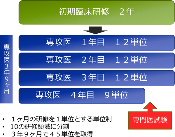 整形外科の研修で経験すべき疾患・病態は、運動器官を形成するすべての組織の疾病・外傷・加齢変性です。この多様な疾患に対する専門技能を習得するために、本研修プログラムでは1ヶ月の研修を1単位とする単位制をとります。全カリキュラムを脊椎、上肢・手、下肢、外傷、リウマチ、リハビリテーション、スポーツ、地域医療、小児、腫瘍の10の研修領域に分割し、基幹施設および連携施設をローテーションすることで、それぞれの領域で定められた単位数以上を修得し、3年9ヶ月で45単位を修得するプロセスで研修を行います。